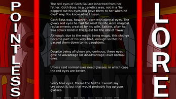 Learn pointless lore about the locations in Threehole and its inhabitants from optional lore dumps, or ignore them entirely! I won't judge you!